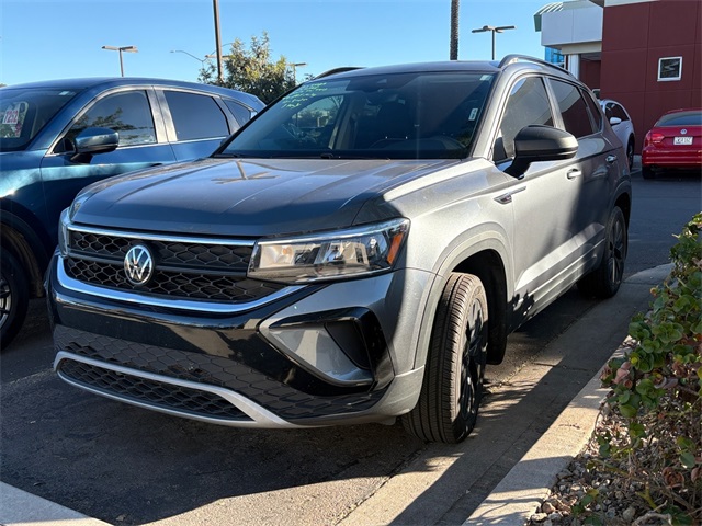 Serving The Valley For Over 40 Years! This Volkswagen Taos is equipped with the following features: 3.23 Axle Ratio, 4-Wheel Disc Brakes, 6 Speakers, ABS brakes, Active Blind Spot Monitor, Air Conditioning, Alloy wheels, AM/FM radio, Auto High-beam Headlights, Brake assist, Bumpers: body-color, Cargo Area Retractable Privacy Cover, Cloth Seating Surfaces, Compass, Delay-off headlights, Driver door bin, Driver vanity mirror, Dual front impact airbags, Dual front side impact airbags, Electronic Stability Control, Emergency communication system: VW Car-Net Safe & Secure 5-year, Exterior Parking Camera Rear, First Aid Kit, Front anti-roll bar, Front Bucket Seats, Front Center Armrest, Front reading lights, Front Strut Rear Torsion Beam Suspension, Front wheel independent suspension, Fully automatic headlights, Heated steering wheel, Illuminated entry, Leather Shift Knob, Low tire pressure warning, Occupant sensing airbag, Outside temperature display, Overhead airbag, Overhead console, Panic alarm, Passenger door bin, Passenger vanity mirror, Power door mirrors, Power steering, Power windows, Radio data system, Radio: Composition Color AM/FM, Rain sensing wipers, Rear anti-roll bar, Rear seat center armrest, Rear Sensors Credit, Rear window defroster, Rear window wiper, Remote keyless entry, Roadside Assistance Kit, Roof rack: rails only, Rubber Mats Kit (SNM), Speed control, Speed-sensing steering, Split folding rear seat, Spoiler, Steering wheel mounted audio controls, Tachometer, Telescoping steering wheel, Tilt steering wheel, Traction control, Trip computer, Variably intermittent wipers, and Wheels: 17" Silver Painted Alloy.